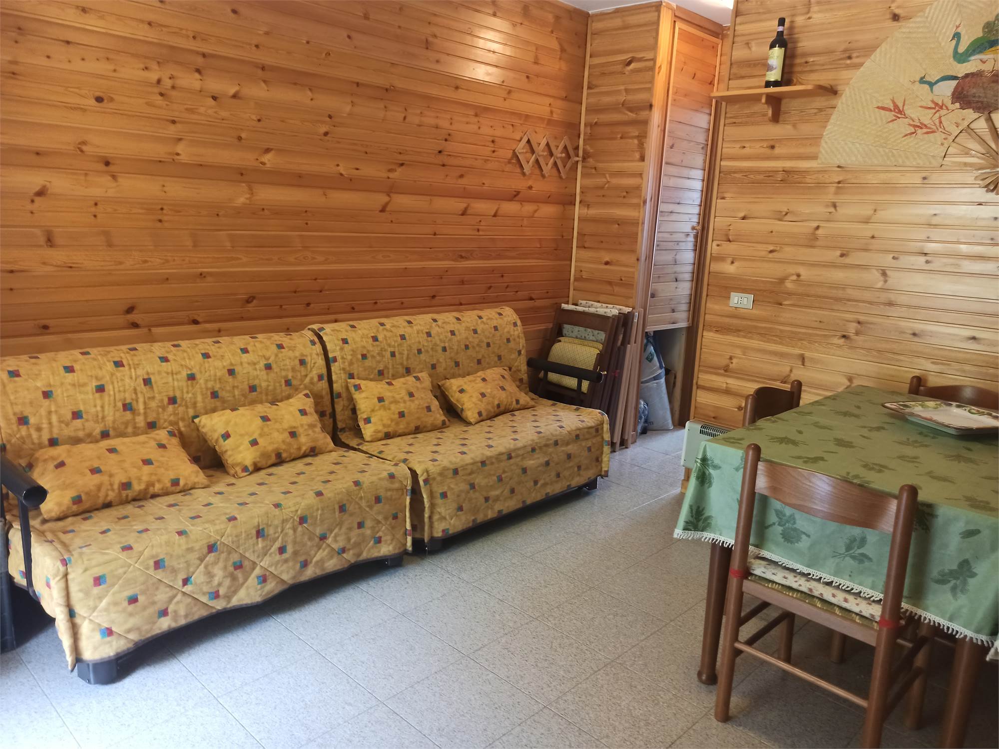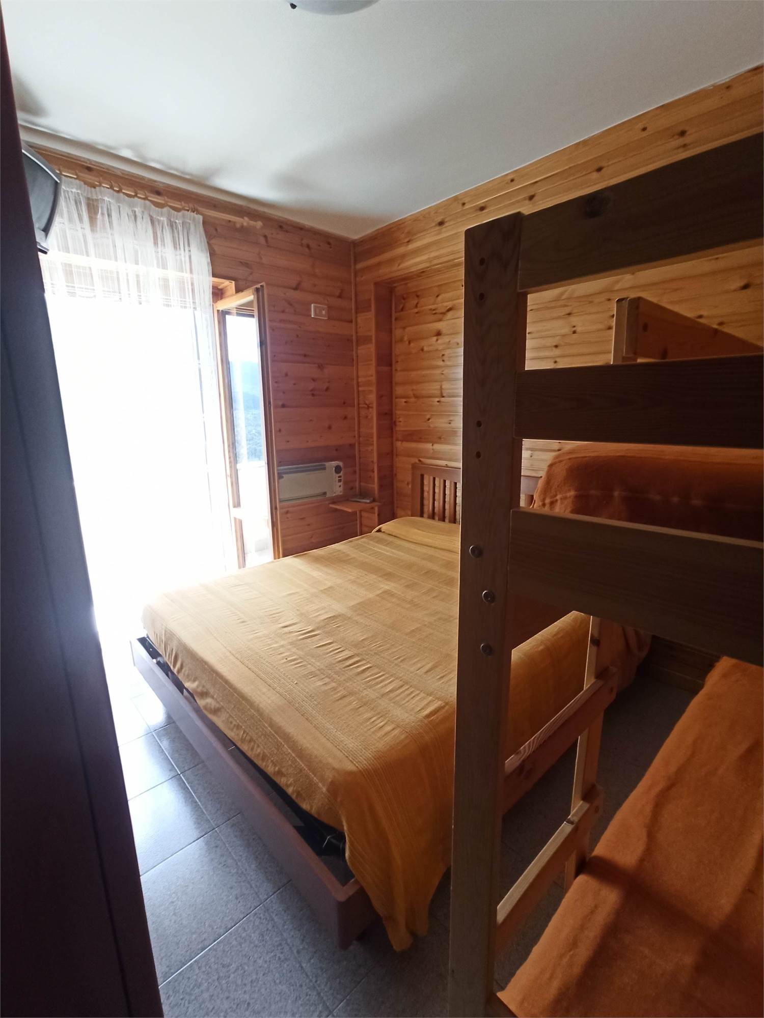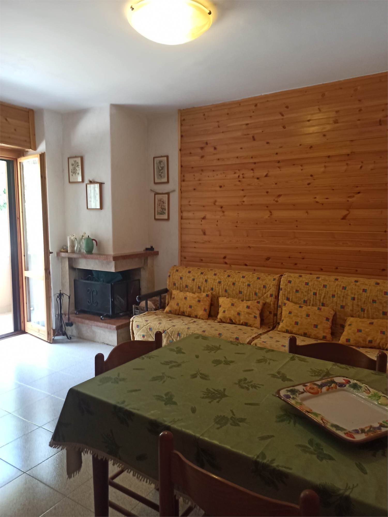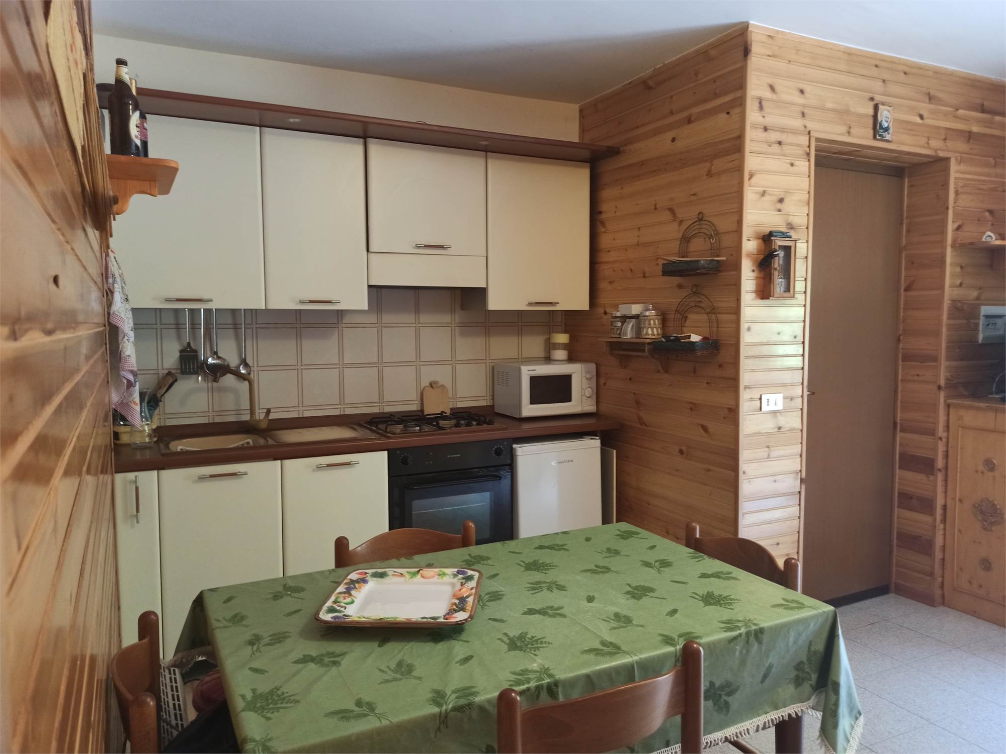 L' appartamento rivestito in legno come i tipici chalet del posto, è un primo piano di mq 56, con due balconi di circa mq 3.0 l'uno, ed è composto da sala con splendido camino angolare, angolo cottura completo di elettrodomestici, arredato con cristalliera, tavolo allungabile, sedie ed un divano letto, qui presente il primo balcone; un ampia camera da letto arredata con un letto matrimoniale ed un letto a castello, armadio in legno a sei ante ed un secondo balcone; un comodo bagno con doccia e finestra; un armadio a muro.